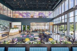 The $130 million project converted the vacant building into a mixed-use complex with more than 300 apartments, coworking spaces, a restaurant, and bar. It opened in June 2023.