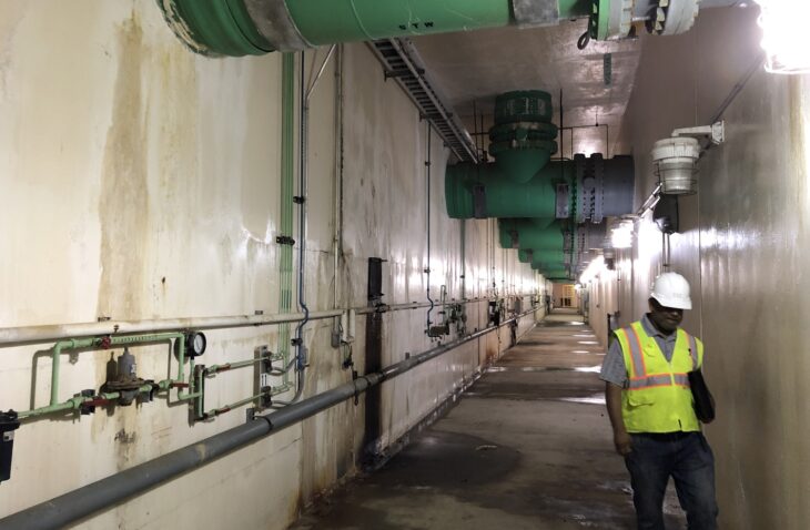 Scope of work: The team evaluated the structural concrete deficiencies and proposed a continuous augmentation/thickening of the walls with other structural enhancements. In addition, the filter walls were blast cleaned and noted cracks injected with hydrophilic urethane. Modifications were made to the 16-inch and 30-inch effluent pipes in the effluent gallery to accommodate the augmented walls. In severely cracked areas at the filter “slots” the concrete wall was partially or completely broken out and replaced with a silica-fume enhanced repair concrete. Due to limited access to the enclosed filter galleries, a shotcrete application was implemented. Mechanical modifications included relocating existing small diameter piping and instrumentation along the gallery walls and cutting and relocating the effluent gallery 30-inch effluent piping, 30-inch manway blind flange, and 16-inch air piping flanges. Electrical modifications included the relocation of minor electrical appurtenances and include outlets and sump pump junction boxes.