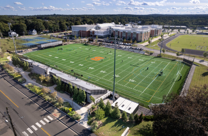A linear park, funded by the Community Preservation Commission, was introduced behind the bleachers and press box, providing an inviting space and improved access on game days.