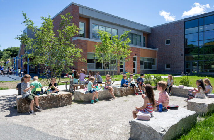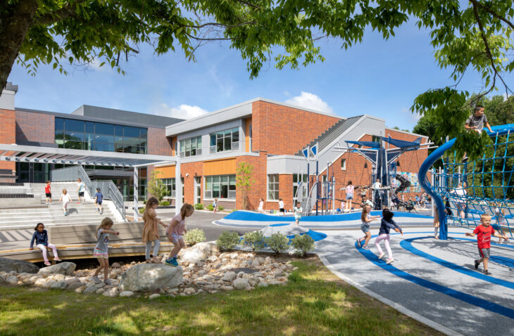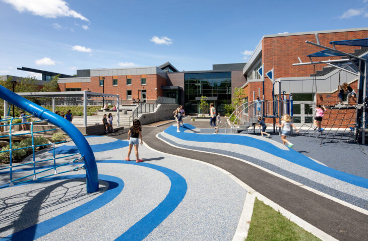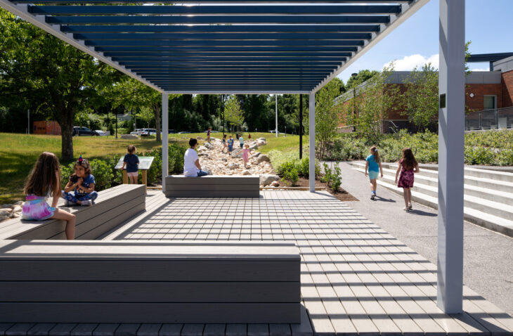 The design: The centerpiece of the site is a terraced amphitheater with a seamlessly integrated accessible ramp, leading to a central stage beneath a pergola – serving as a multifunctional hub for both learning and play. Stormwater management is addressed through a dry streambed that filters runoff from the surface parking lot into a rain garden, supporting sustainability goals. Additional features include age-specific play areas, a courtyard, outdoor classroom and dining space, hard courts, and open fields.