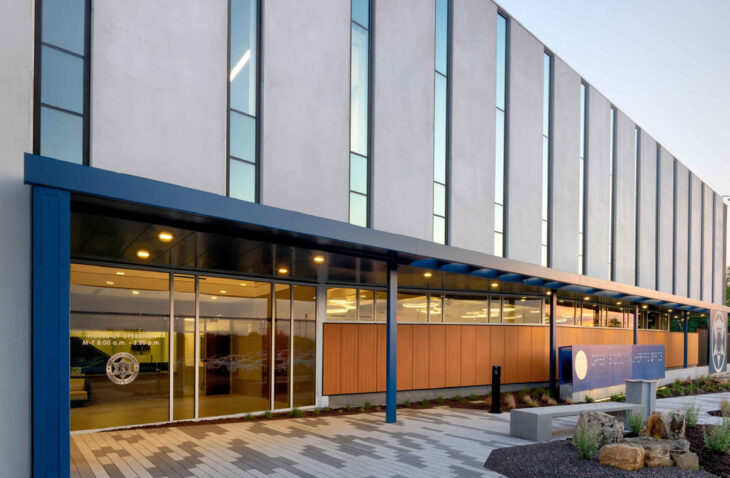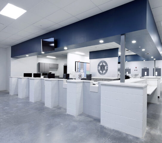 Attached to the jail is the new multi-service Sheriff’s office and training building. The 62,000-sf Sheriff’s building is comprised of jail administration, records, locker/showers, and service and dining areas. The 4,700-sf training building houses four classrooms, evidence storage, drug storage, vehicle processing, a K-9 area, and armory. Other additional building services include a 2,700-sf vehicle storage building and 1,250-sf of support services including 16 video court booths, booking, bonding, warrants, transportation, kitchen, laundry, and medical facilities.