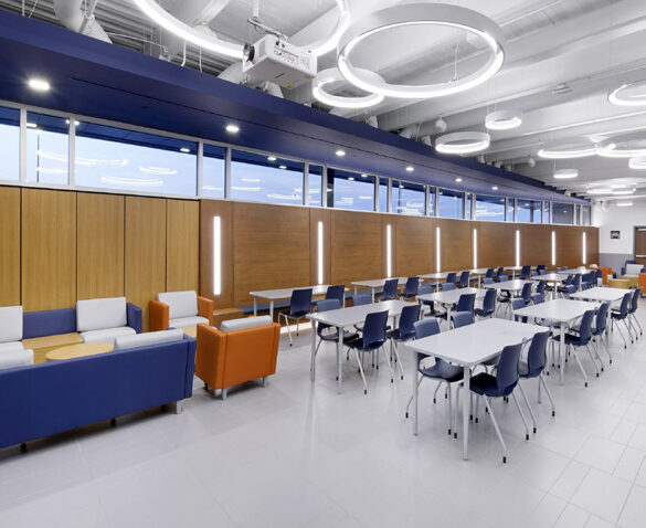 Engineering Designs: The HVAC system is a four-pipe type with roof-mounted air handling units and energy recovery for the housing area. Magnetic bearing water-cooled chilled and high-efficiency condensing hot water boilers were also provided.