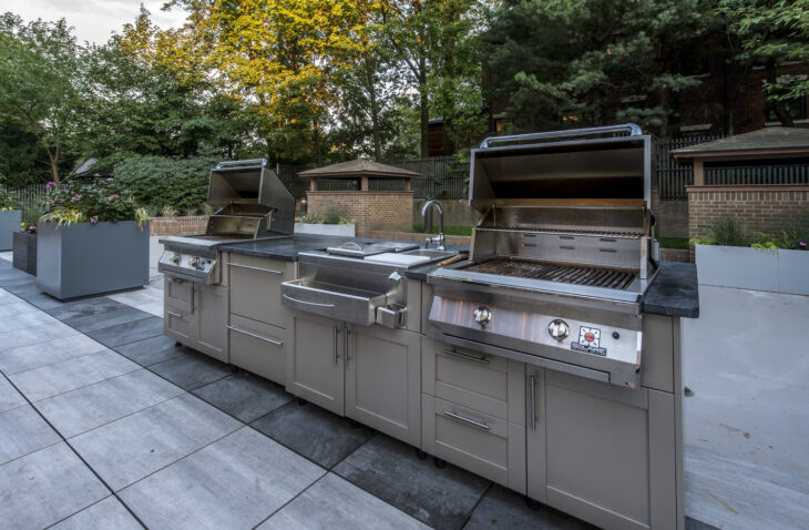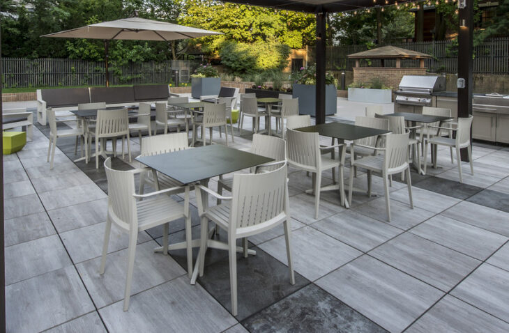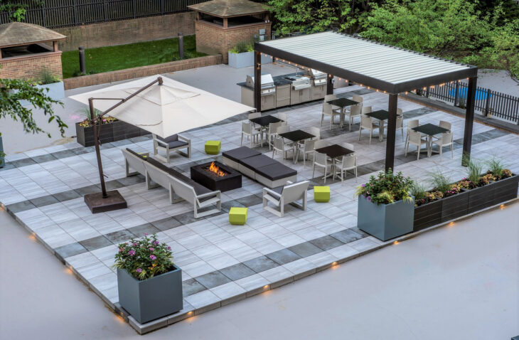 The design: The design offers a paved plaza with multitude of seating options, fire table, sun lounging, large communal dining area, built-in outdoor kitchenette with gas grills, refrigerator, and a motorized pergola that offers customizable shade. The hardscape of the plaza is softened by use of several planters offering a visual buffer and sense of privacy. The building has a brick façade, and the remaining existing plaza is colored concrete. The choice of materials – from the porcelain paver tiles that resemble driftwood along with the high-end European all-weather site furnishings in taupe – bring a sense of richness while blending in seamlessly with the existing façade. Matching the ornamental forest grass, a bright green accent color adds brightness to the sophisticated muted tones. Strategically placed landscape lighting further illuminates the mood, allowing residents to enjoy the space through dusk.