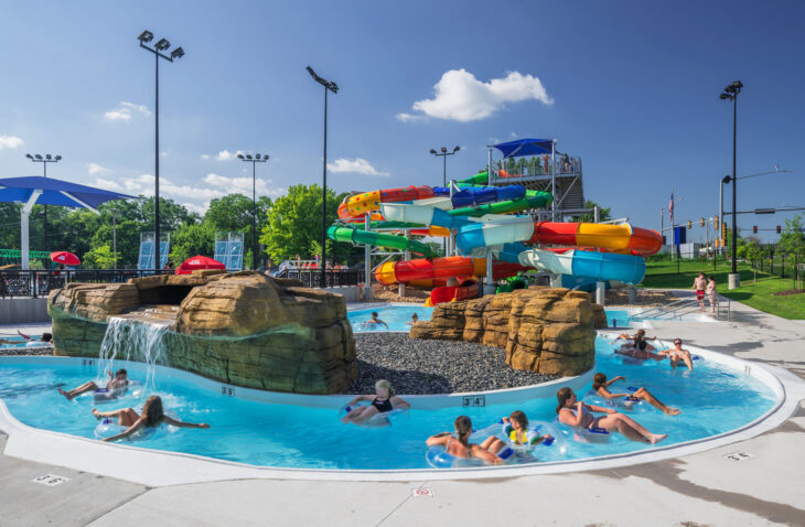 Project amenities: The Landing includes a lap pool, slides, zero depth entry pool, splash area for children, ice skating rink, warming building, concessions building, restroom building, and filter building. The ice rink doubles as an outdoor lounge area in the summer.