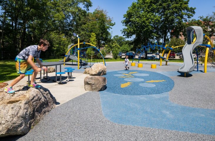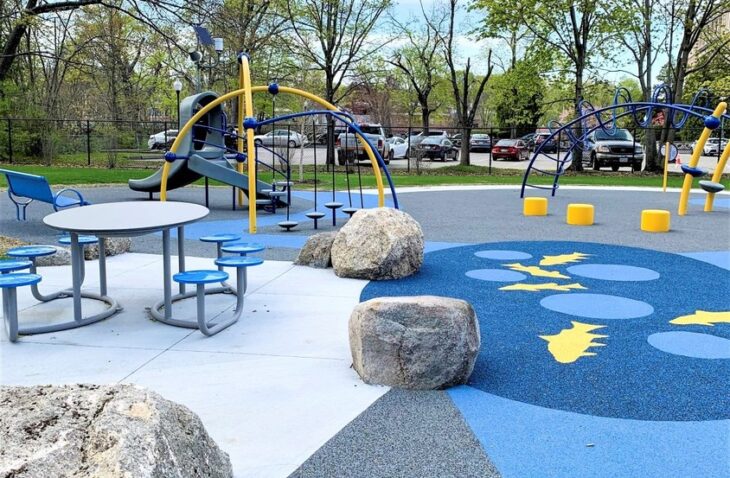 The design: Given its close proximity to the Shawsheen River, the design was inspired by the flowing nature of this natural landmark. Mimicking a stream of water, the safety surfacing varies in shades of blue and gray, creating an asymmetrical path across the playground. The natural boulders scattered throughout and the fish-shaped safety surfacing further allude to the river motif. The picnic area nestled amidst existing and new shade trees is strategically placed in the center of the playground to work as a river overlook for the Lower Shawsheen Playground.