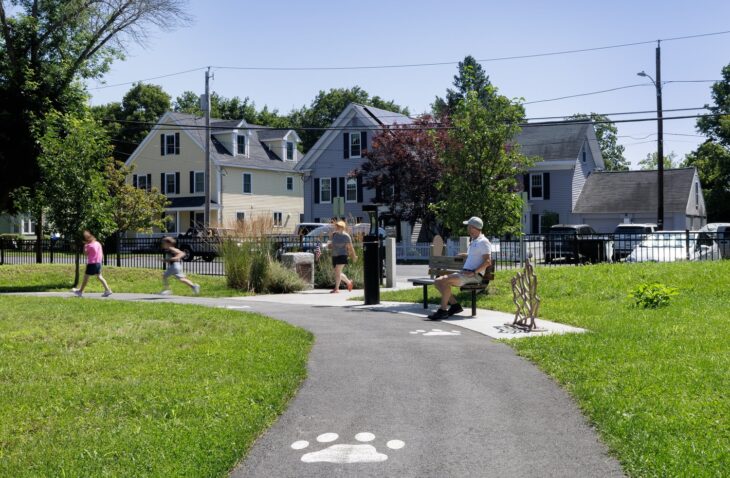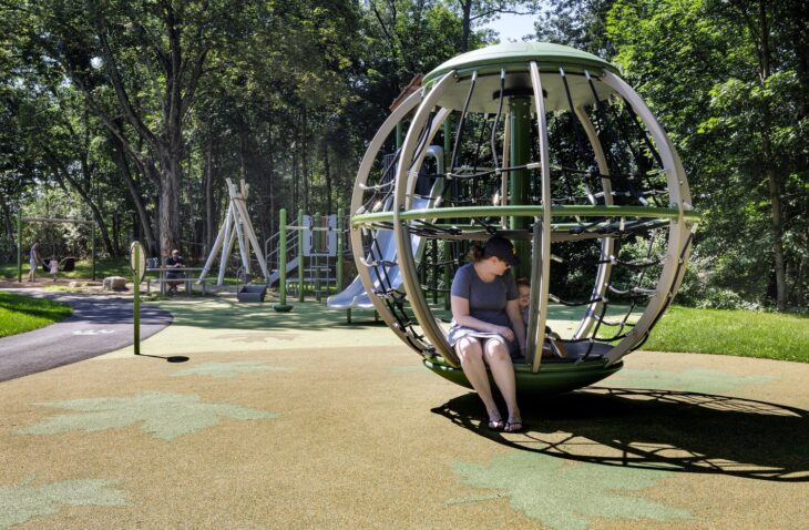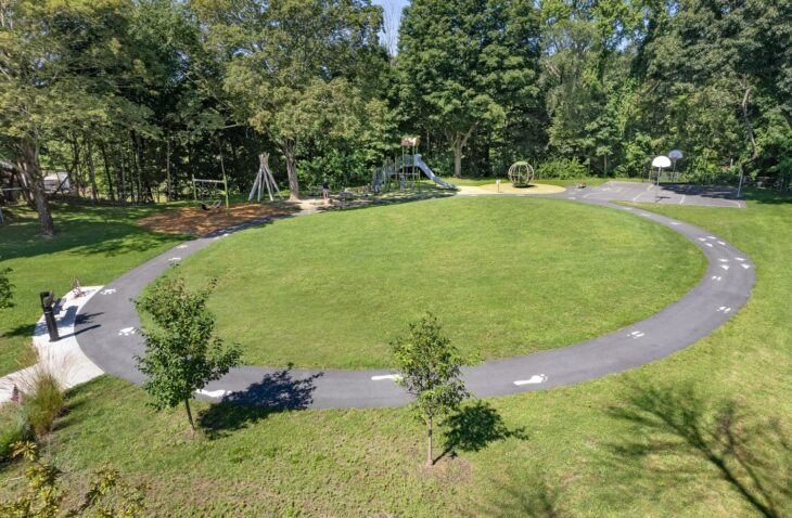 The design: The park’s proximity to the Indian Ridge conservation woodlands and wetlands involved an approval process which was led by our team. The new design increased the impervious areas from the existing conditions and therefore incorporated a rain garden for stormwater collection. The design was inspired by a tree house in the woods, immersed in nature and full of imagination. The focal aspect of the design, the oval lawn flanked by an asphalt loop, allows for a flexible space for community events. The walking loop and playground safety surfacing are decorated with animal prints and leaf patterns that reflect the native flora and fauna of the area, providing an educational and unique value to the space.