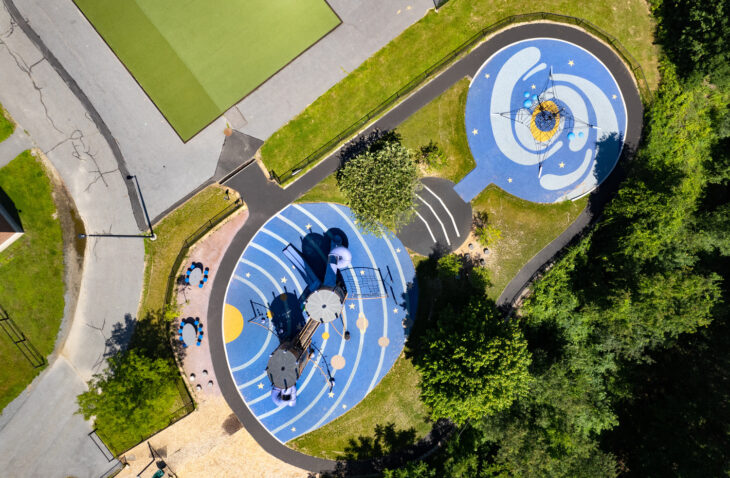 The design: The colors for the play structure along with the solar and galaxy theme safety surfacing pattern were intended to be futuristic along with offering educational inspiration. New site amenities and shade planting was provided throughout the playground. An amphitheater seating and