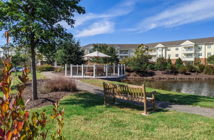 Design approach: The site design enhances the existing pond by incorporating a scenic water feature with an overlook deck, complete with picnic tables and shaded seating. A wellness-focused, accessible path winds through the community, connecting a variety of engaging destinations, including an outdoor cookout area with comfortable furniture under a shaded pergola, sensory gardens, vegetable gardening spaces, and active recreation areas featuring bocce and pickleball courts.