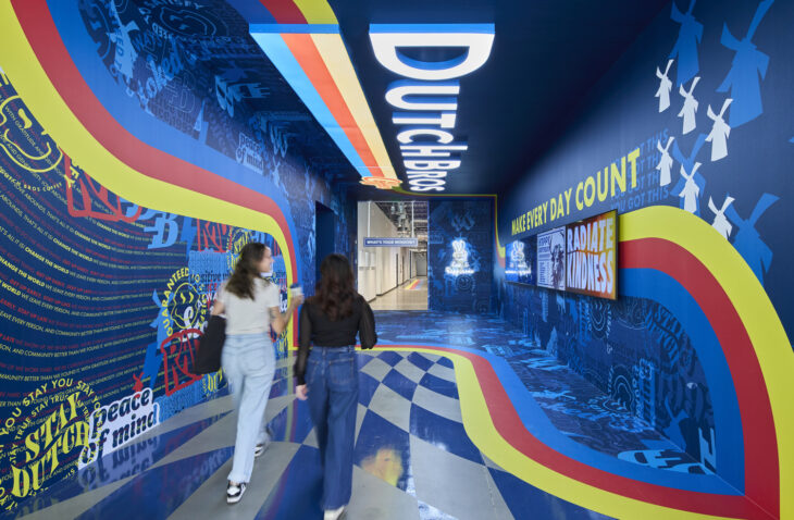 The project: The tenant improvement for the new headquarters space for Dutch Bros. Coffee is a two-level space housing multiple coffee shops, open office and collaboration areas, focus rooms, private offices, conference rooms, break room, fitness room, relaxation room with massage chairs, photo and video editing room, game lounge, arcade, and pickleball court. A “hype tunnel” entryway to the lobby features graphics, signage, and digital displays to get employees and visitors excited about visiting the office.